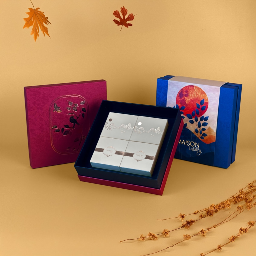 Phiên bản hộp “Thu Phong” của thương hiệu bánh trung thu Maison gây ấn tượng mạnh mẽ nhờ thiết kế hai lớp sáng tạo và đầy tính nghệ thuật. Ẩn sau lớp đai bọc là một bất ngờ tinh tế: họa tiết những chú chim trên cành lá được thể hiện bằng kỹ thuật ép kim sang trọng, tạo chiều sâu thị giác và cảm xúc đầy tinh tế.