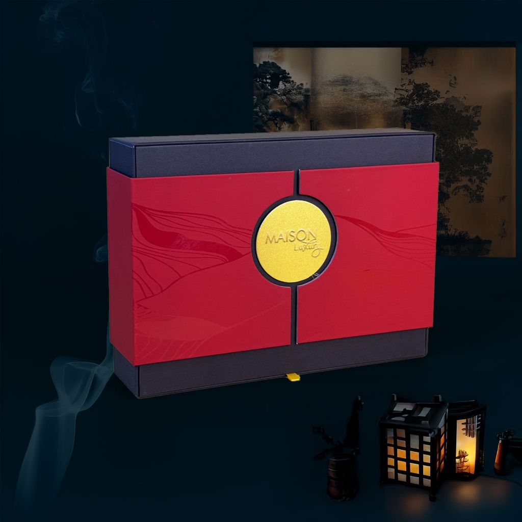 Lấy cảm hứng từ ý nghĩa “Trường An” – sự bình yên lâu dài và viên mãn, hộp bánh trung thu Maison Trường An gây ấn tượng với cấu trúc hộp cánh mở sáng tạo, tạo nên trải nghiệm mở hộp đầy bất ngờ và trang trọng. Lớp vỏ hộp màu đỏ trầm kết hợp nâu trầm lịch lãm, được in offset và phủ màng nhung cao cấp, tạo cảm giác mượt mà, sang trọng khi chạm tay.