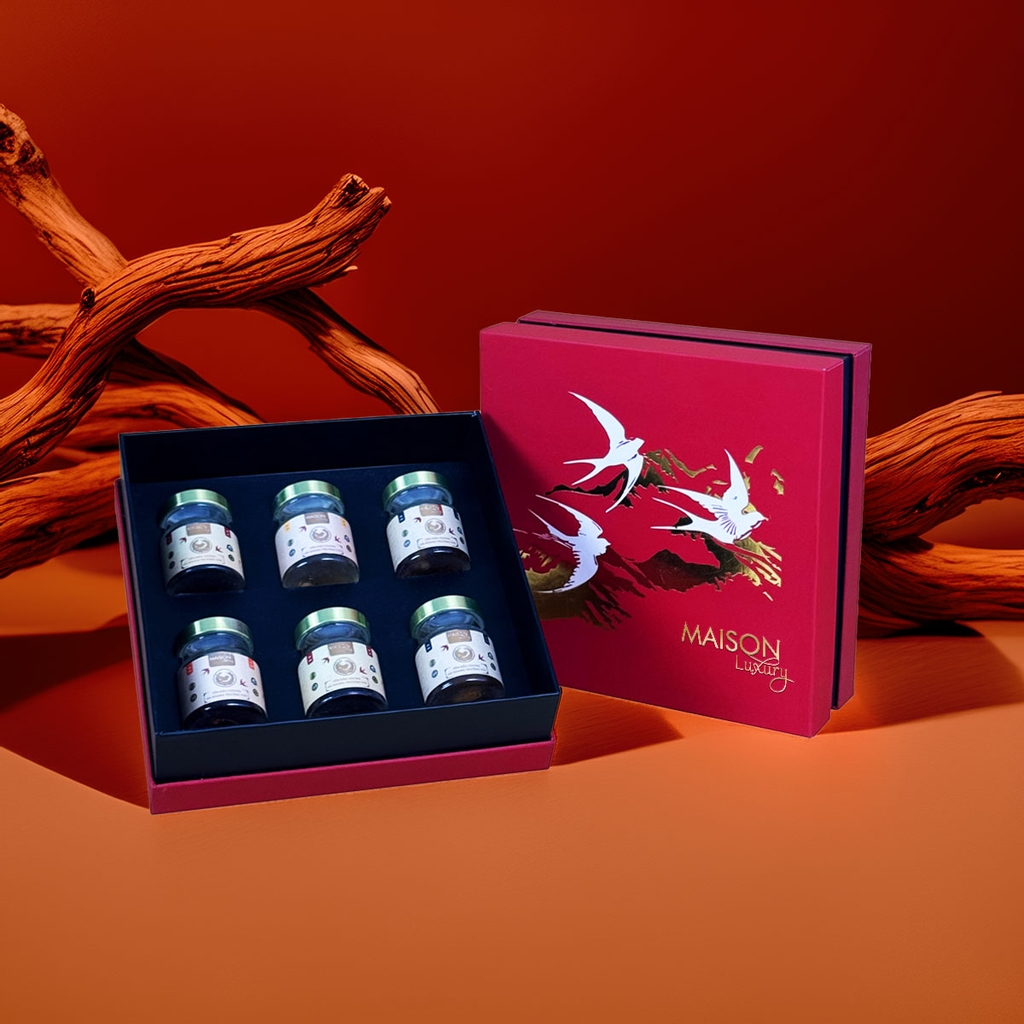 Quy cách đóng gói: Hộp quà sang trọng gồm 6 lọ yến chưng với hương vị khác nhau
