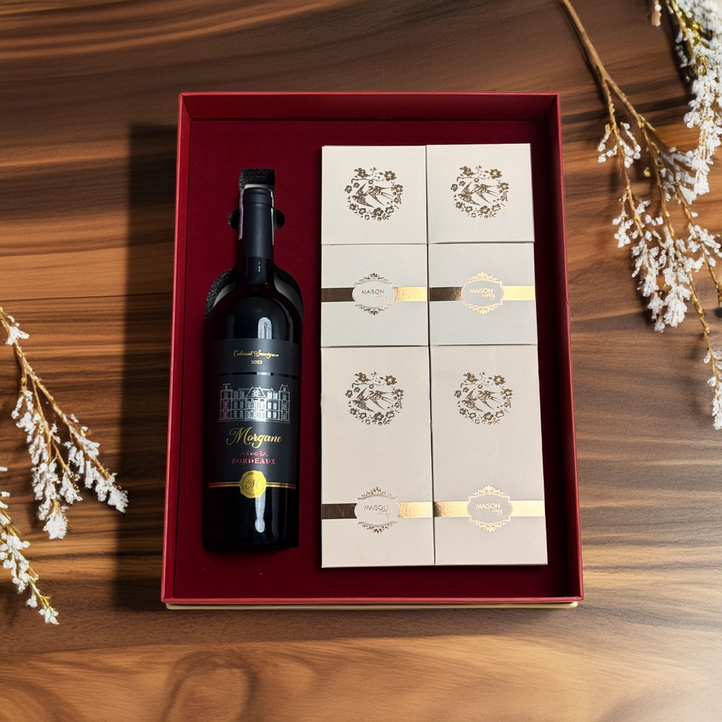 Bên trong là rượu vang nhập khẩu thượng hạng kết hợp cùng các sản phẩm Maison chọn lọc, tạo nên món quà Tết Maison ý nghĩa – vừa đẹp mắt, vừa đậm vị Tết truyền thống.