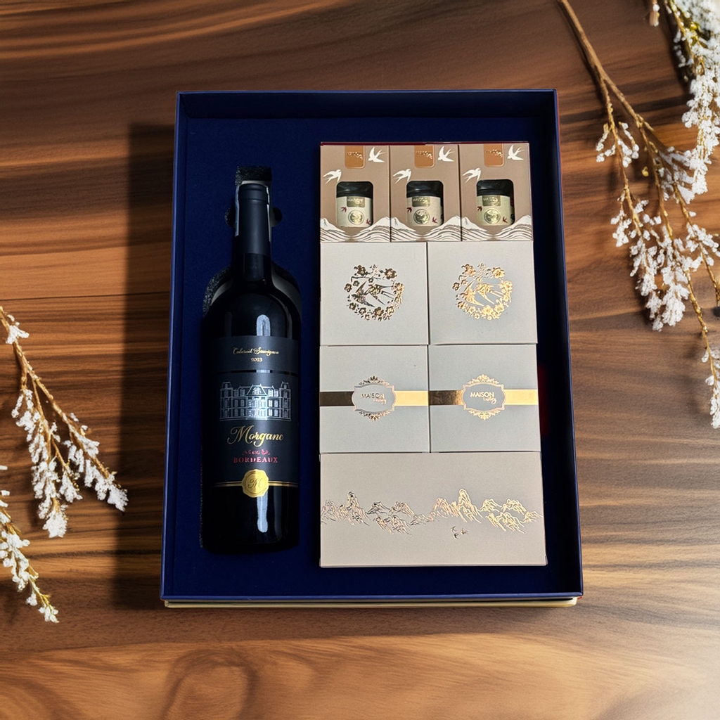 Bên trong là rượu vang nhập khẩu thượng hạng kết hợp cùng các sản phẩm Maison chọn lọc, tạo nên món quà Tết Maison ý nghĩa – vừa đẹp mắt, vừa đậm vị Tết truyền thống.